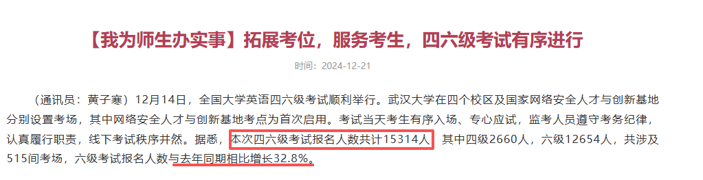 武汉大学2024年下半年四六级报名人数达15314人,其中六级报考人数同比增幅高达32.8%,创下该校四六级报考历史新高,部分学生甚至因抢不到考位错过考试;