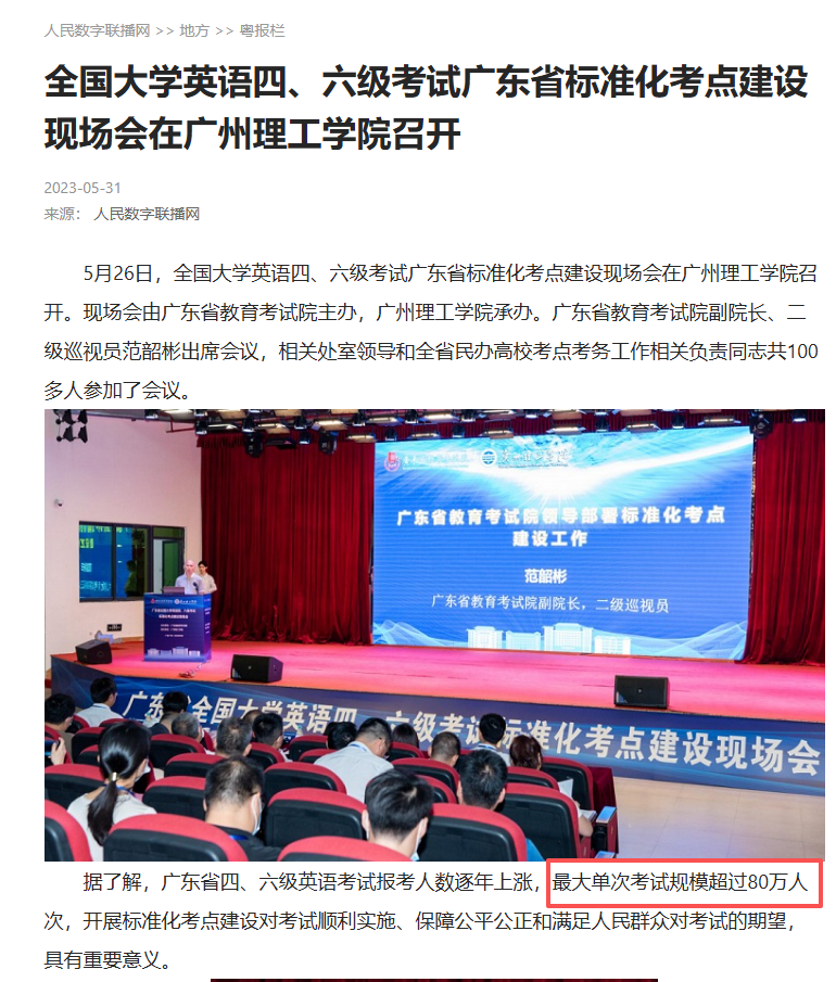 广东省作为高校集中省份,单次四六级考试规模超80万人次,即便在2023-2024年期间集中投入资源扩建标准化考点、增加考位数量,仍无法完全缓解考位 “一位难求” 的现状,考位竞争愈发激烈。