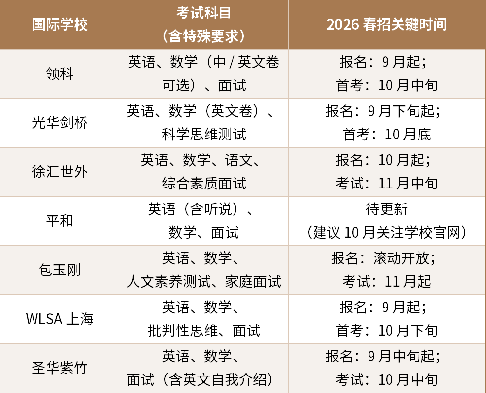 截至9月中下旬,上海已有30余所热门国际学校公布了2026年春招安排,考试时间集中在10月至次年1月,领科、光华剑桥、徐汇世外等头部院校的首考时间较往年提前了1个月,意味着留给学生备考的时间仅剩1-2个月。若错过这一轮机会,后续秋招的竞争压力将大幅增加。