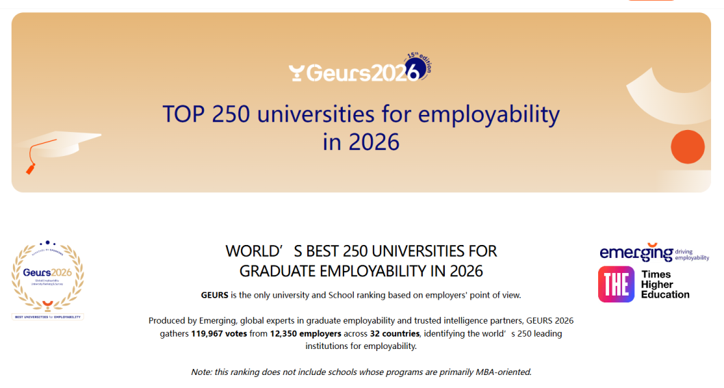 近日,备受全球留学圈与雇主界关注的权威榜单正式揭晓:泰晤士高等教育(THE)联合人力资源咨询公司 Emerging,共同发布了2026年全球大学就业力排名(GEURS)。这份排名堪称 “雇主视角的人才培养*单”,背后汇集了32个国家/地区、12,350家企业雇主的119,967份真实评价,最终筛选出全球250所*擅长培育 “职场适配型人才” 的高校。