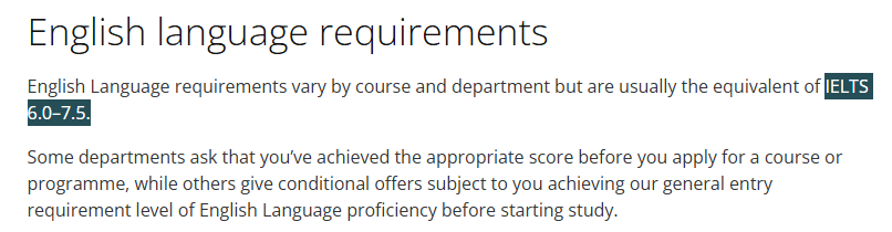 雅思要求:因专业而异,总分6.0-7.5不等;部分理工科可接受总分6.0(单项 5.5),商科、文科多要求总分7.0(单项 6.5)。