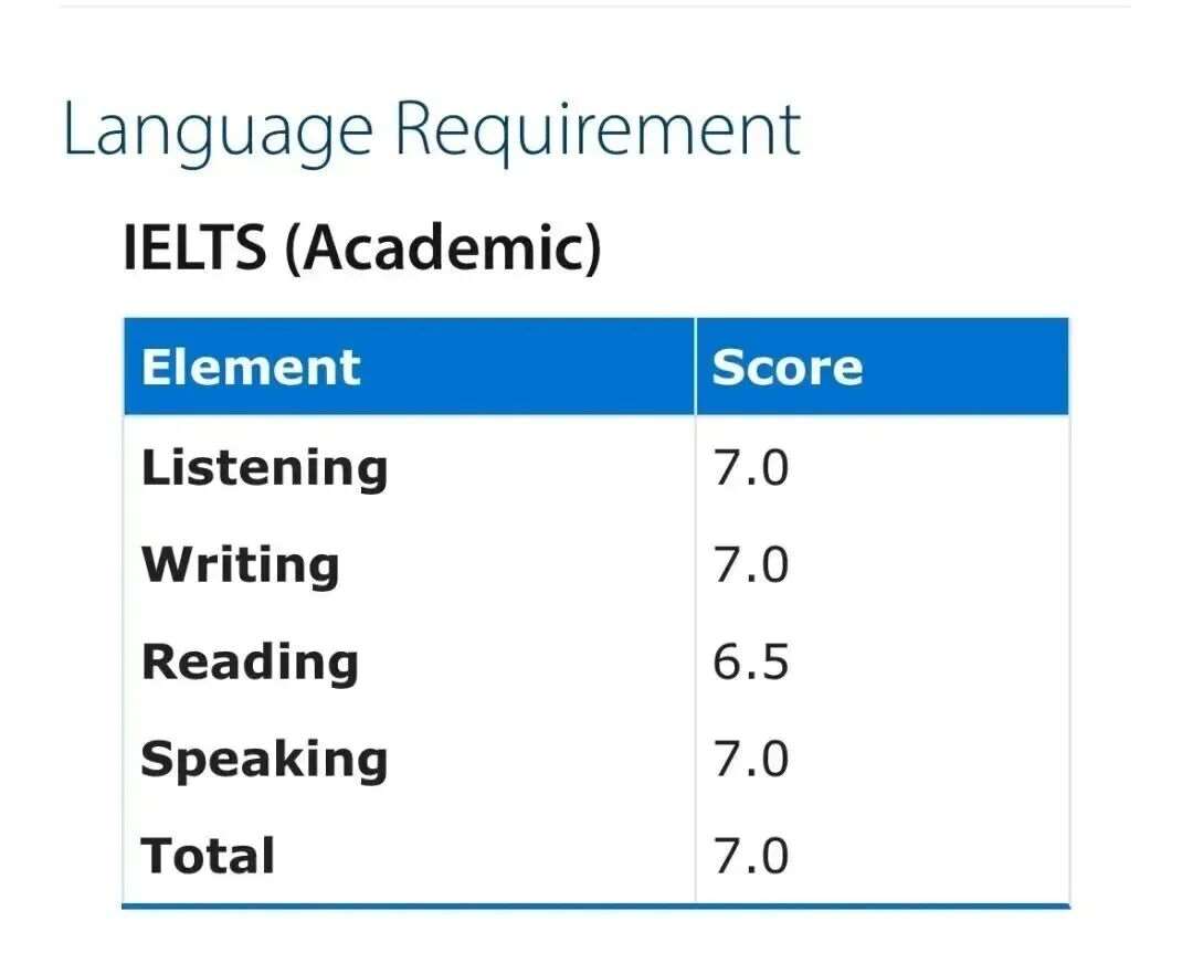 雅思要求:无统一标准,由专业自主设定,需单次考试达标,不接受单科重考;热门专业多要求总分7.0(单项6.5)。
