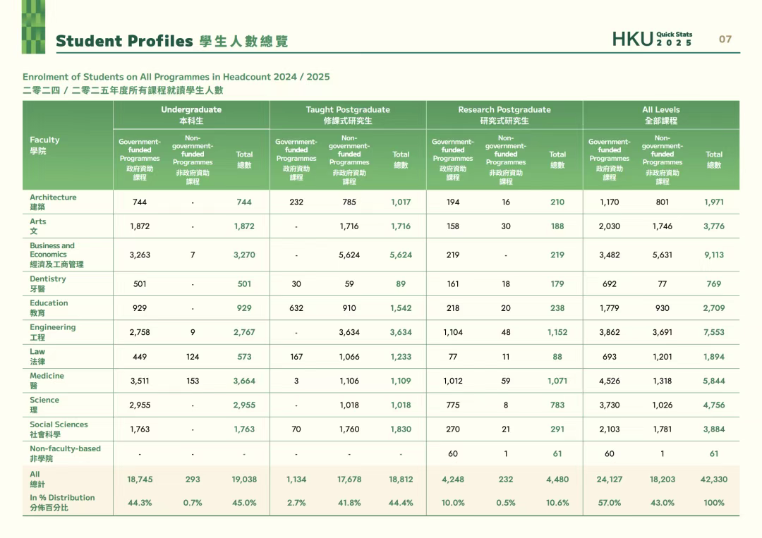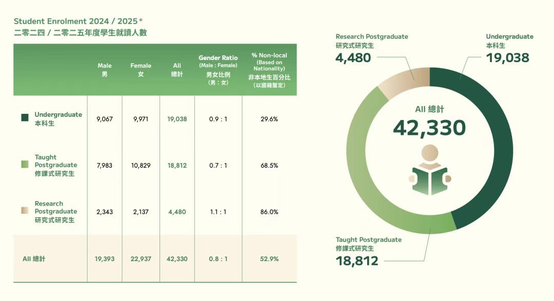截至2024/2025学年,港大在校学生总数达42,330人,较上一学年的39,166人新增3,164 人,同比增长8%,学生规模呈持续上升趋势,办学体量稳步扩大: