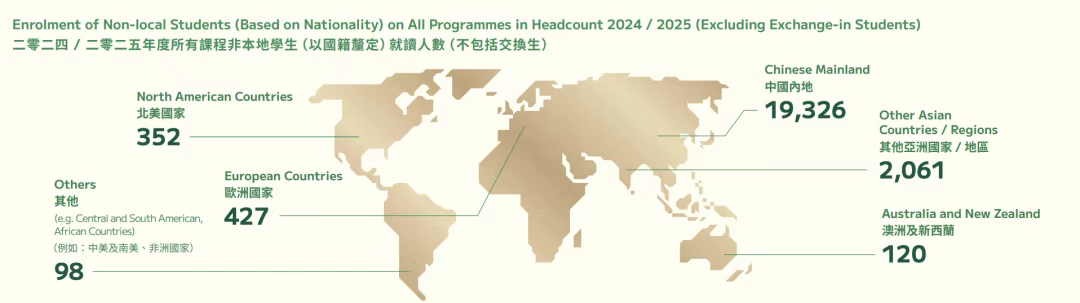 港大作为国际化学府,生源地分布兼具全球影响力与区域吸引力。据《2025年香港大学数据报告》,2024/2025学年在校非本地生(不含交换生)中,内地生为核心,同时覆盖全球多地区,形成多元格局。