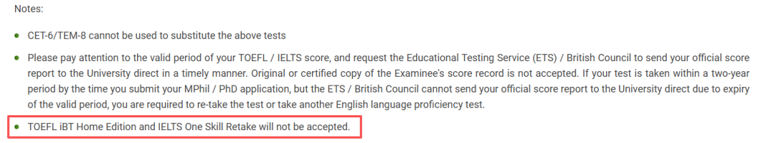 语言*有效期为2年,不接受雅思单项重考、托福家考等*。
