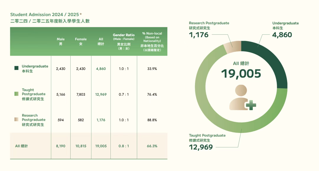 从《2025年香港大学数据报告》来看,港大 2024/2025学年录取规模稳步扩大,总计录取新生19,005人,涵盖本科、修课式研究生、研究式研究生三个层次:
