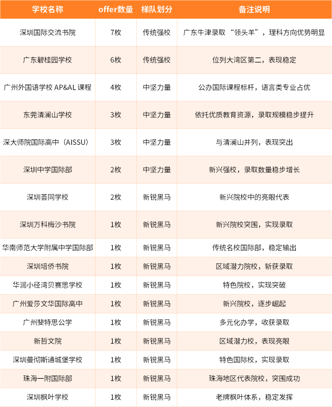 大湾区全域发力:录取学校覆盖深圳、广州、佛山、东莞等多个城市,区域分布均衡,体现大湾区国际教育资源的协同发展优势。